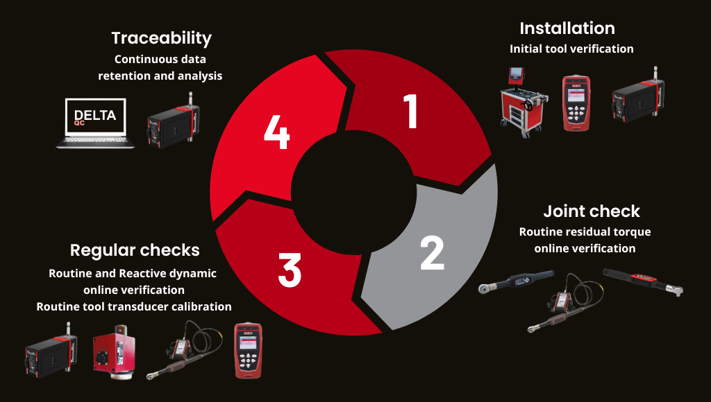 Residual torque checking is the process of measuring the remaining torque on a joint after tightening. This step ensures that the joint maintains the correct torque level and helps identify any potential relaxation. It is a critical step for safety-sensitive applications: detecting joint relaxation early prevents failures and guarantees compliance with torque specifications. Residual torque checking can be carried out during a new assembly process to confirm proper tightening or to verify relaxation under torque or over torque conditions.